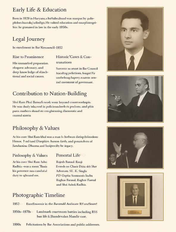 At his core, Shri Ram Phal Bansal was a man of discipline, honor, and faith. Guided by the eternal principles of Sanātana Dharma and inspired by the Gita, Ramayana, and Vedas, he believed law was not merely a profession but a sacred duty to uphold truth and serve the nation.